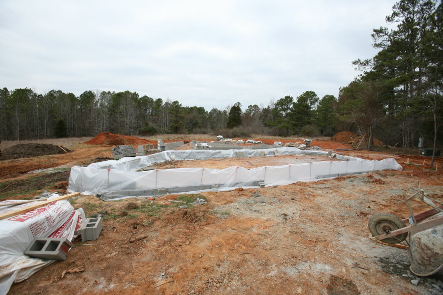 Here’s a cool feature of the tall walls starting to take shape: the shear wall. As you can see, some of the blocks have no cells—they are designed to let the cement fill the entire void betwen the two withes. That’s going to be one massive, strong structure!