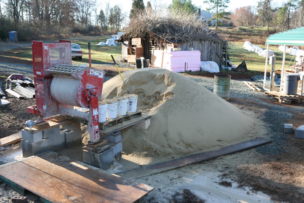 For example, after the 11th course had been completely the outer wythe needed to be grouted to continue the concrete fill down to the last grouted level (which I believe was just below the 8th course). The grout did use up some of our sand pile:
