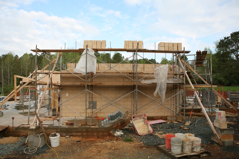 But, as threatening as it got, it never actually rained when it mattered. So the blocks stayed at the ready, the mortar was mixed, and progress continued…