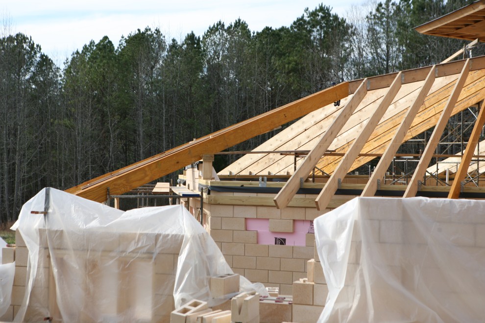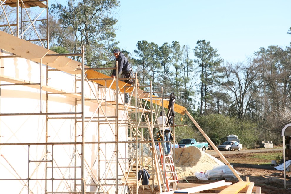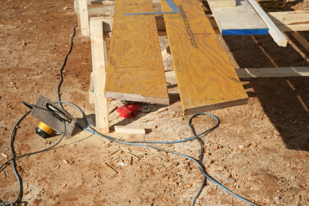 Before this past week, I had thought that the maths involved in framing a 5:12 pitch roof was fairly straightforward: for every 12 feet of run, there’s 5 feet of rise, and so there’s not much to figuring out how to cut a rafter and put it into place. That may be so for rafters that are running perpendicular to the walls and/or roof pitch, but things get a lot more interesting at the hips, when two facets of a roof come together to form one common line. If you don’t believe me, check out these hip shift and hip drop calculations. With many tangents and arc tangents, it’s not for the faint of heart! And so our brave carpenters begin the most complex part of the Control Room roof yet: the hips…