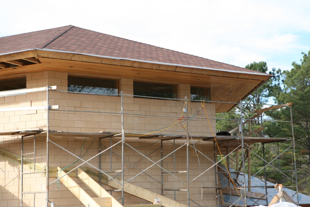 But we can also see quite a bit of other work, namely the installation of the mitred glass windows and several more courses of Cypress soffit material where there was none before: