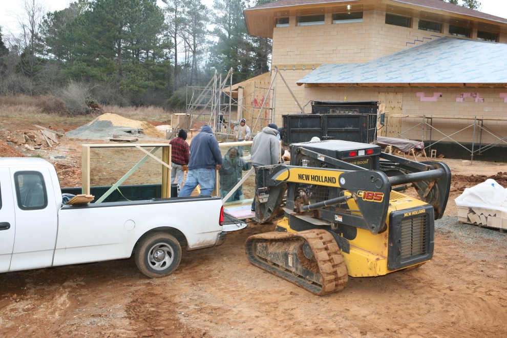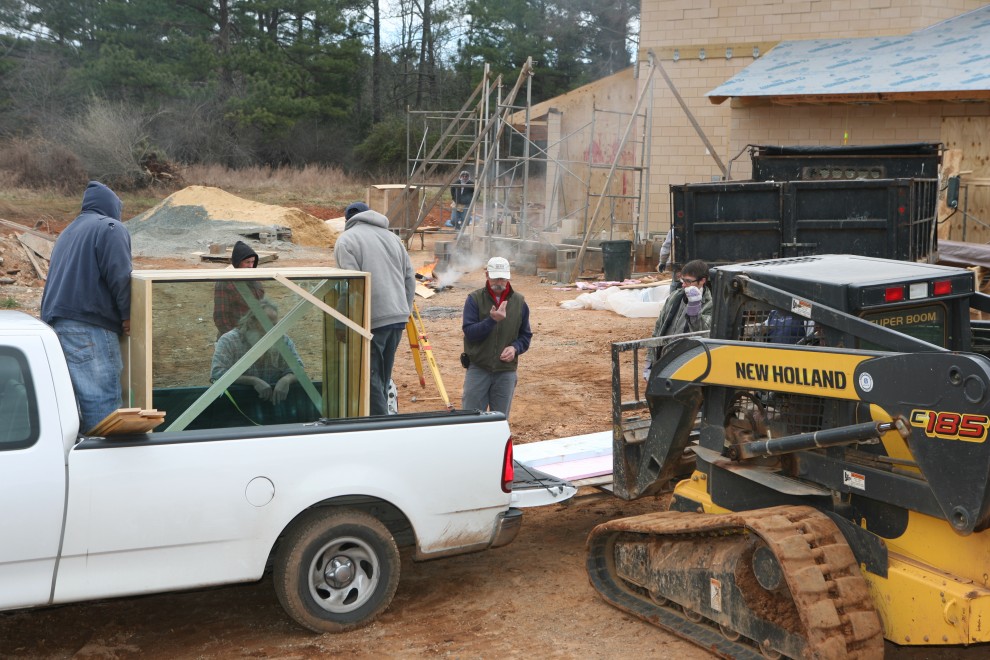 I understand that the 1/2″ glass weighs 7 lbs/sq ft and the 3/4″ glass weighs 10.5 lbs/sq ft. Our windows are 56″ wide and 4′ tall, so the glass weight of the window is 17.5 lbs/sq ft * 18-2/3 sq ft = 327 lbs. The wood framing is about 180 lbs, making the windows 500 lbs each. For all of you with 1/2 ton pickup trucks, two windows is your carrying limit!