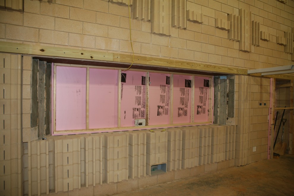 Here you can see that we’ve blocked the Control Room window with a few sheets of pink foam, framed in place: