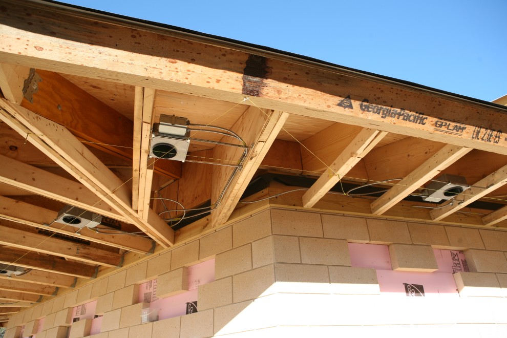 You may recall from last week that the electricians could not place one of the fixtures correctly because the soffit lookout was on the wrong side of the rafter. Problem solved:
