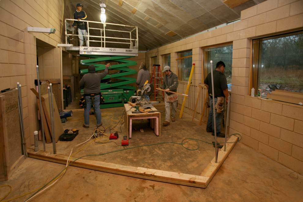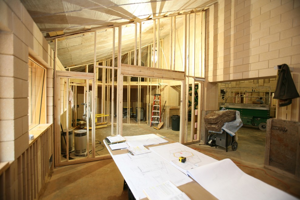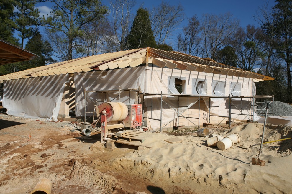 Weather has been quite a challenge lately, and both snow and rain slowed down our efforts to complete the Annex roof. Nevertheless, there were enough good days to at least enter the final stretch of the roof framing process: sheathing the roof.