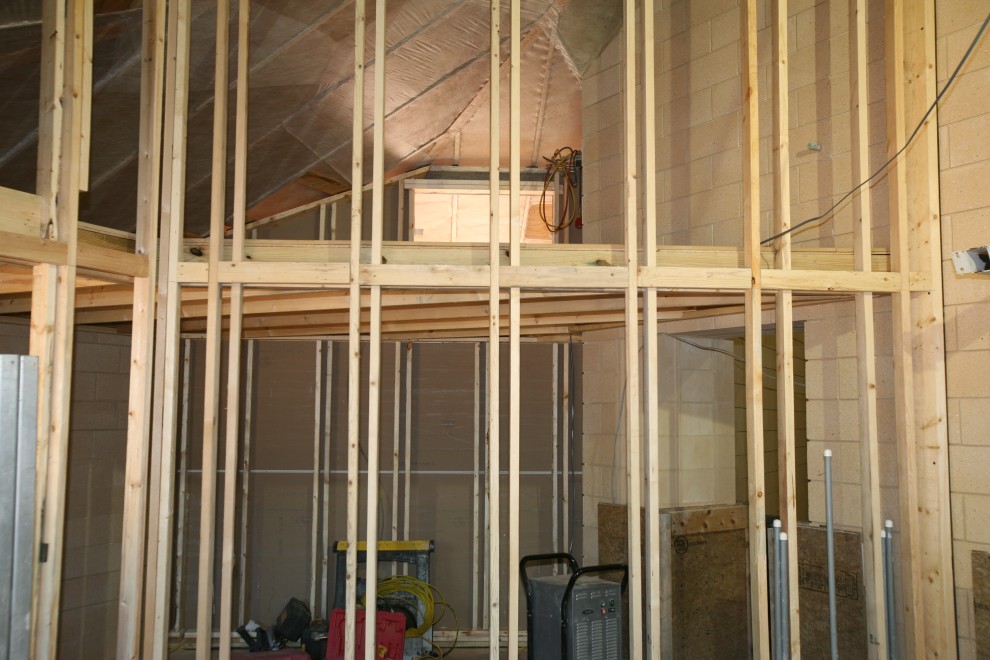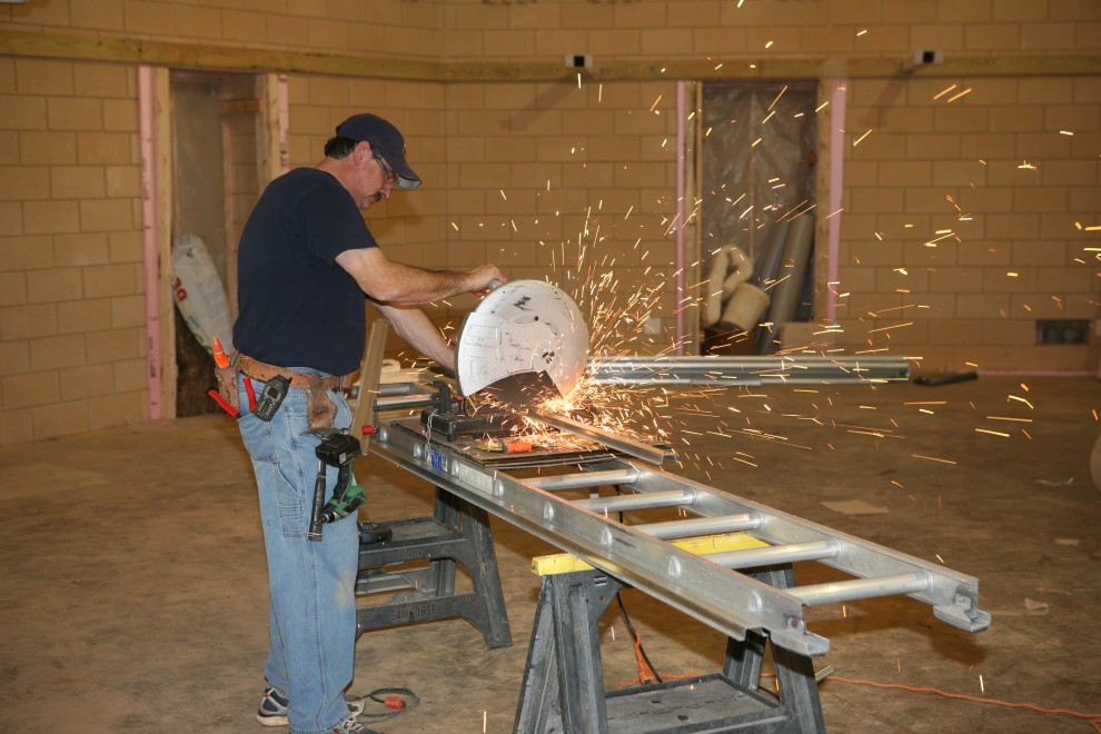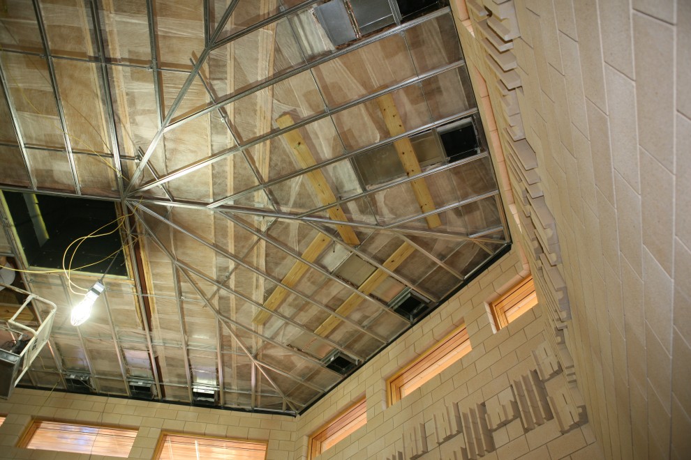 The sparks are flying from 20ga steel furring, also known as “hat channel”. The hat channel hangs from our spring isolators and creates a matrix of attachment points for our gypsum sheetrock. Here’s some partial progress on the West side of the Music Room: