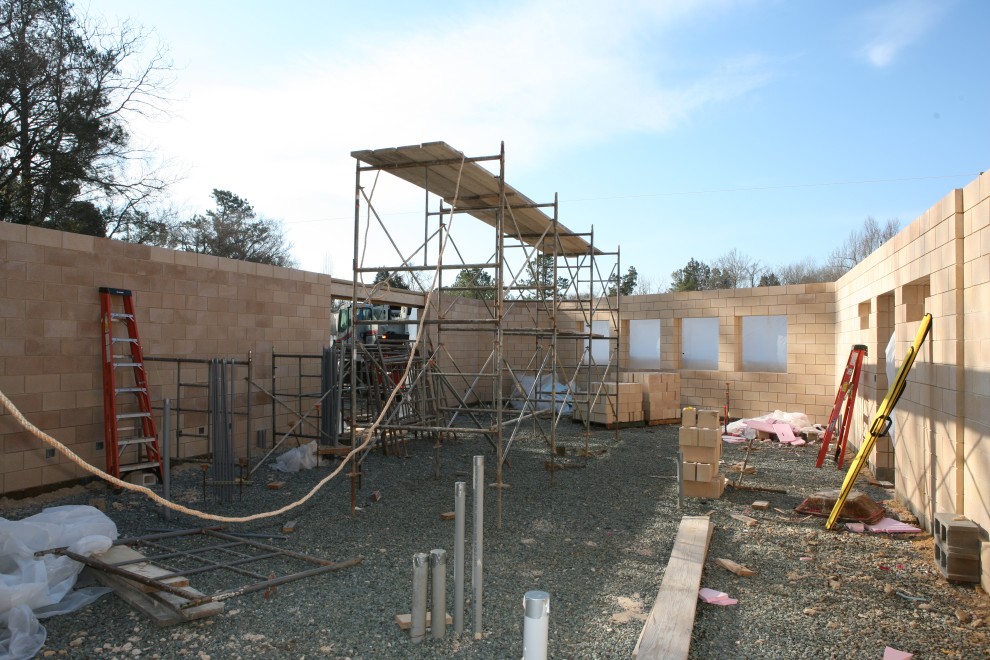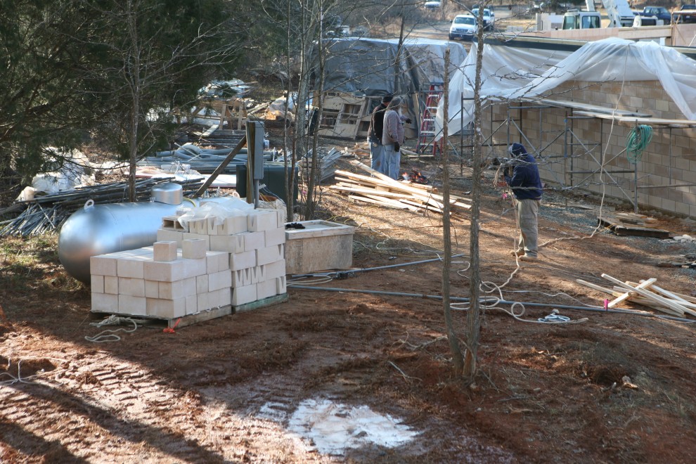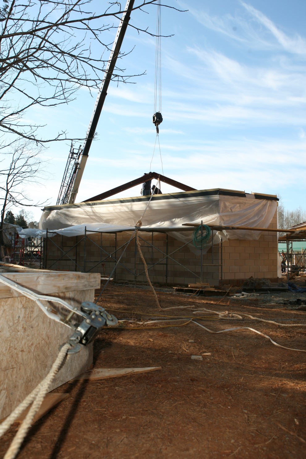 Two things you can notice in addition to the scaffolding is the heavy rope that goes out of the frame to the left and two pallets of blocks beyond the scaffold, in front of the lounge window voids. The heavy rope leads to another two pallets of blocks beyond the Annex to the north. The function of all these pallets is to act as anchors. When the huge W10x77 beams are swung into place, they will be tack welded at their bases, but they will also be secured from falling over by attaching to these anchors North and South. Here are the North anchors: