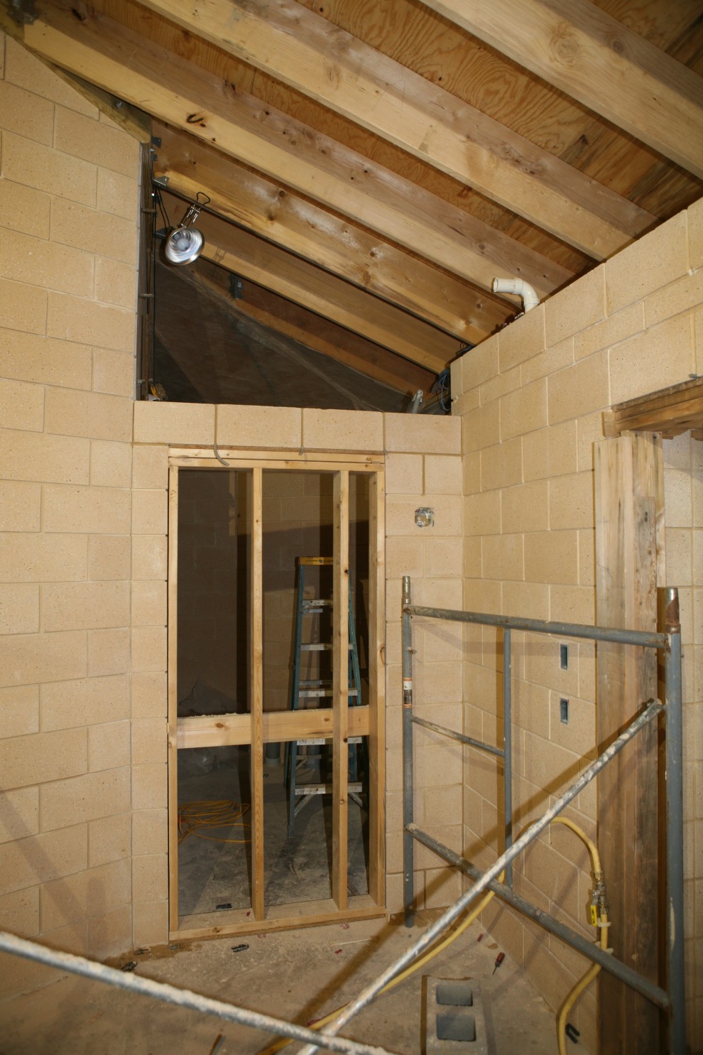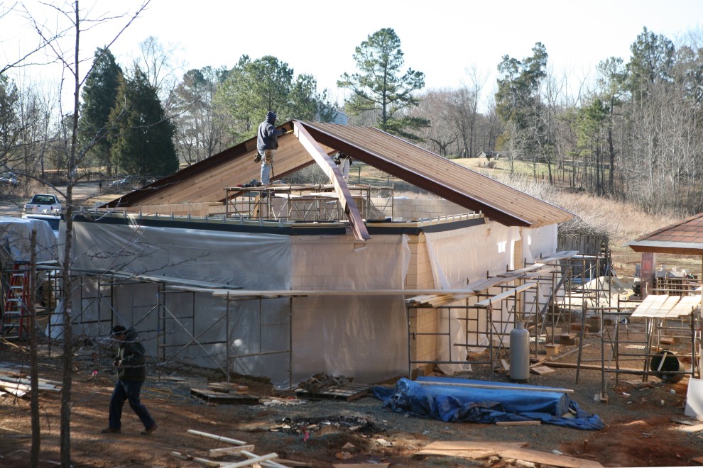 This week we crowned 14 courses of masonry with the framing of a roof: