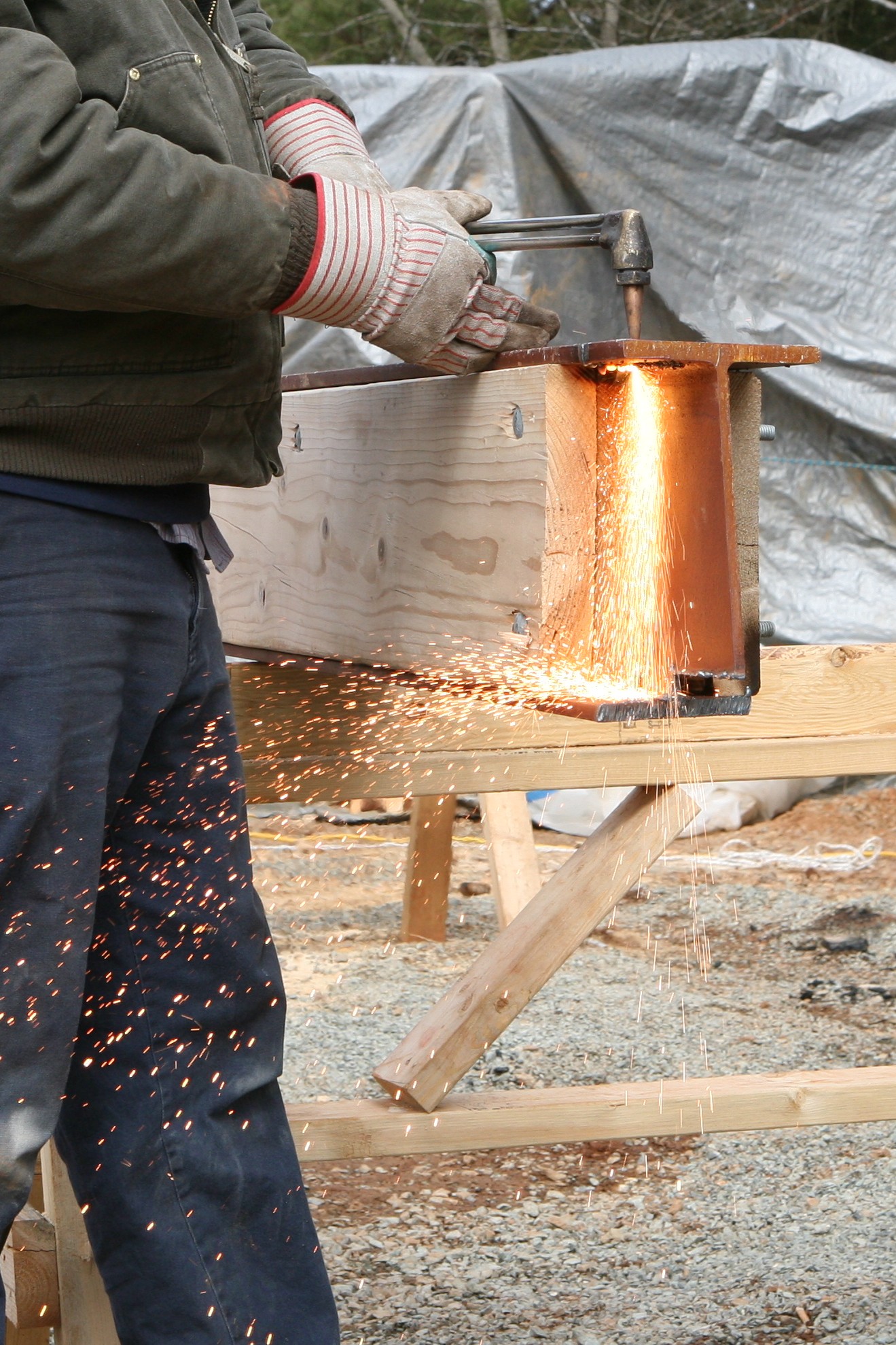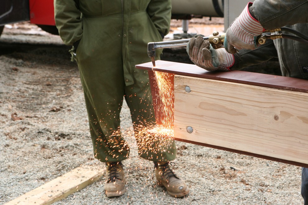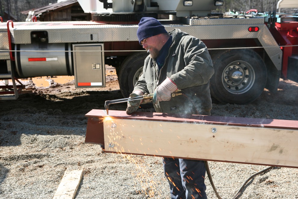 The beam is hoisted into place, and then the welder prepares his flame: