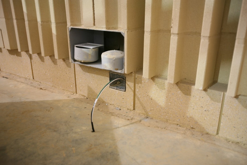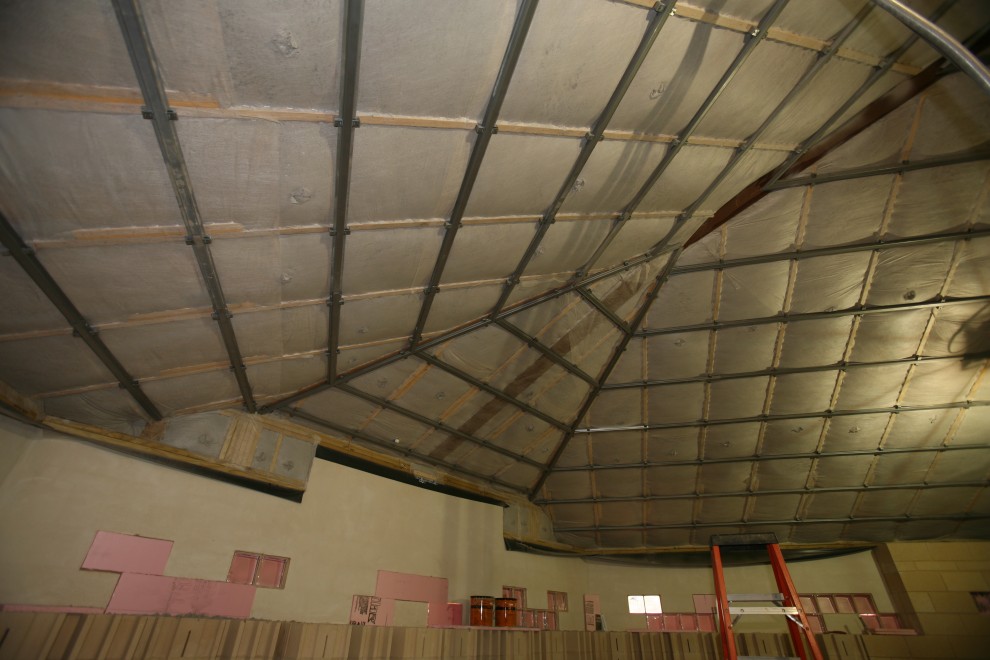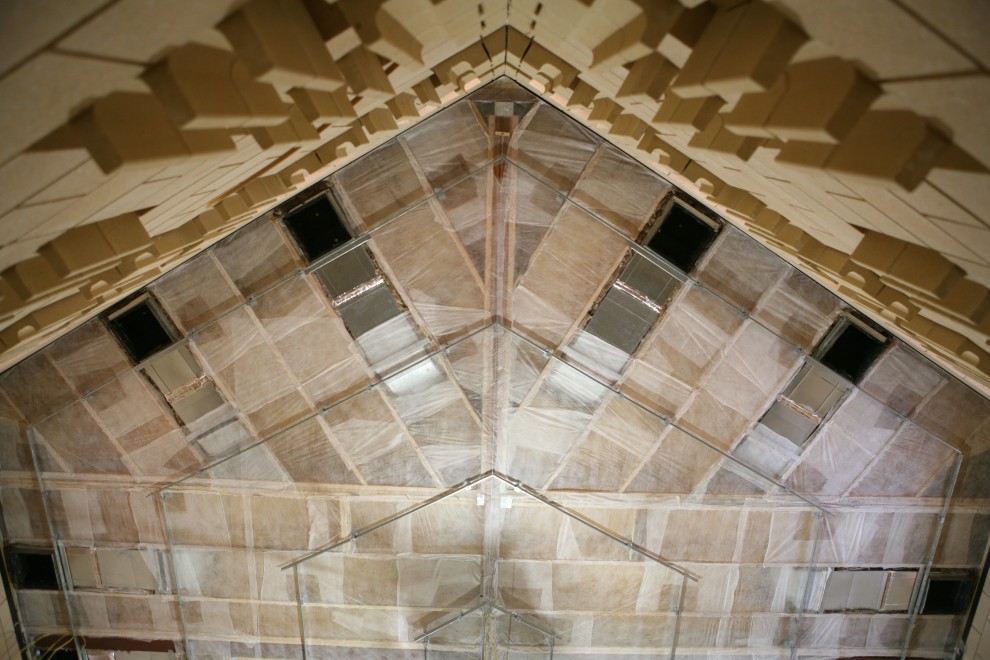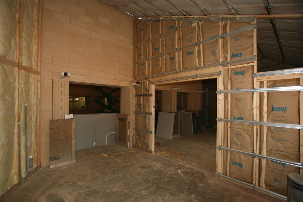 Moving over to the Booths, we see from the West side of Booth A that the walls now have their insulation fill: