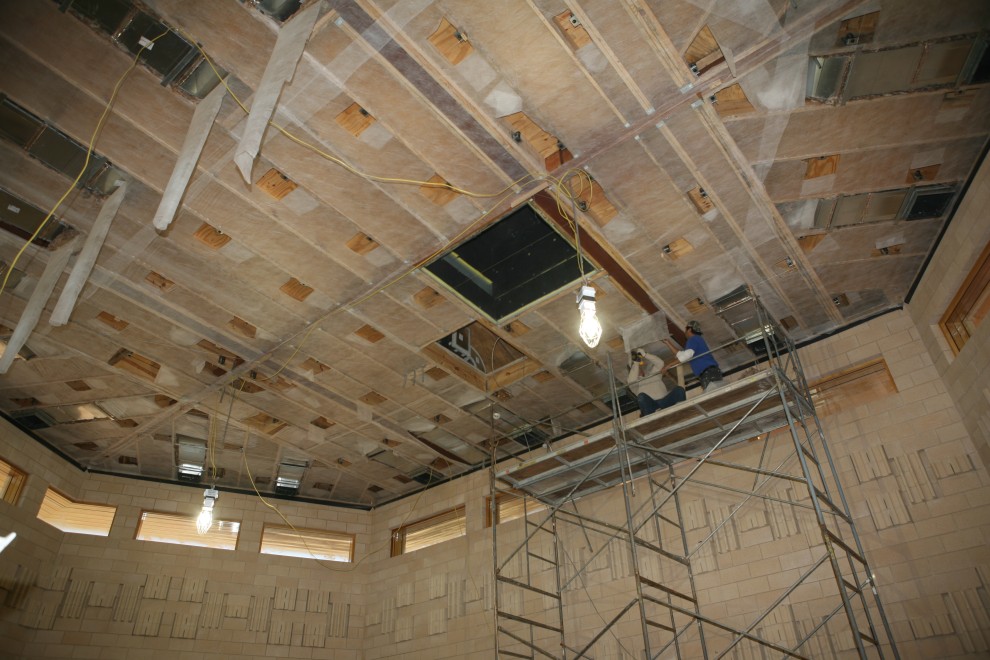 And now for the part of the story I cannot express in pictures…the acoustics. Prior to the installation of the sheetrock, the Music Room ceiling was full of blown-in cellulose, which is pretty dead stuff. Thus, the Music Room had some sound to it, but as live rooms go, it was pretty dead. All that changed, and dramatically so, with the installation of a hard ceiling. Designer Wes Lachot has been spending a lot of time on site (thanks Wes!) and as we passed through the newly clad ceiling, he clapped and estimated that our RT60 was now up to 3 seconds. As the walls were going up he promised that the acoustics of the room would change, and change, and change again before being finally tuned. All of a sudden the live room is really, really live. That will change a lot when we install the acoustic cloud (some time between April and May). And the sound will also change when we add the 10 10′ tall RPG diffusor panels on the front wall and the 13 smaller panels on the other 5 walls.