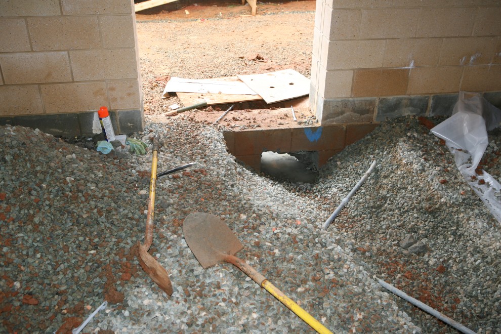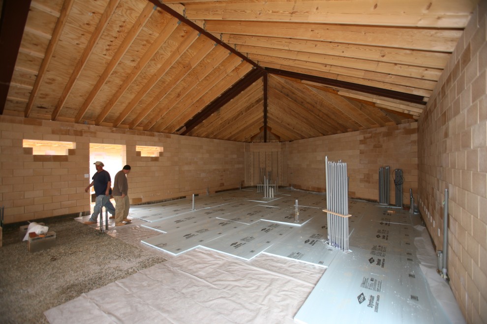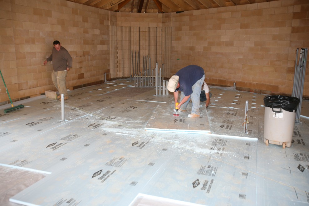 And still more…when the variable weather (and changing landscaping plans) proved unfavorable to further block work, the masons shifted their focus to preparing the Annex slab. The first step was laying down the vapor barrier of plastic and the insulation layer of foam: