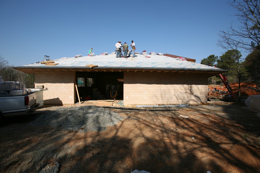 Good weather on Tuesday brought the roofing crew out to put shingles on the Annex roof. Here they are getting the singles into position: