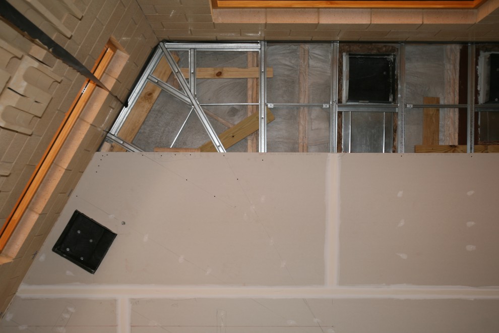 But even at this stage the Control Room is beginning to take on its own characteristic sound. The insulation filling our 2×12 rafters is dead, dead, dead, and it will stay that way when three layers of sheetrock are installed and the cloud and the soffits do their sound-eating work. The front wall presently has a large void where the window will be (which is effectively a perfect absorber) and a large solid wall above that void. This is upside down compared to what will be in the finished room: reflective glass and a hard wall below that makes up our RFZ, and an absorptive cloud above. But on balance it’s about the same. When one talks in the control room, one hears lots of diffusion and lots of neutrality in the response already. It sounds very, very neutral, which is of course very different than the Music Room’s very, very live sound.