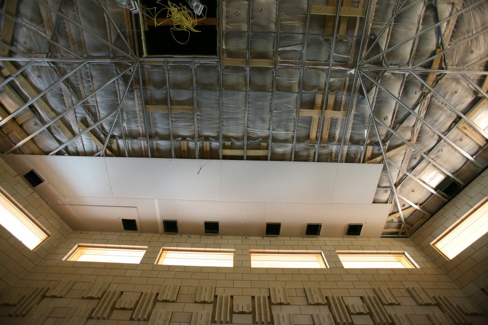 It’s hard to believe that we’ve been under construction for more than two years without cutting, installing, or taping a single sheet of sheetrock, but it’s true. Last week we took delivery of 10 tons of sheetrock and this week it started going up: