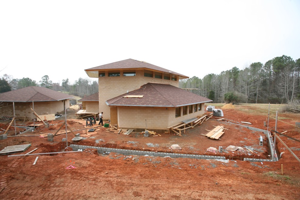 As the roofing team made their progress, the masons, too, were positioning their materials. They pulled apart several cubes of gray block, positioning groups of blocks to where the foundations for the North patio would be laid: