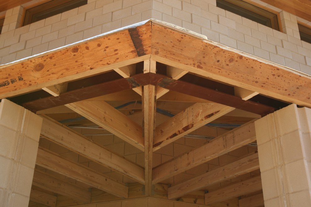 Last week we saw the placement of the Loggia Roof rafters. This week the rafters were sheathed with plywood and the roof framing was finished, including the extensive and finely finished soffit lookouts. Here we are midway through the sheathing process: