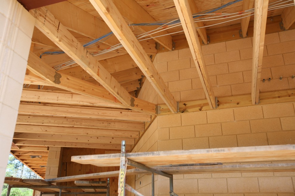 And for you carpentry nerds, a photo showing the rafters (sloped framing members) rising above the lookouts (horizontal framing members):