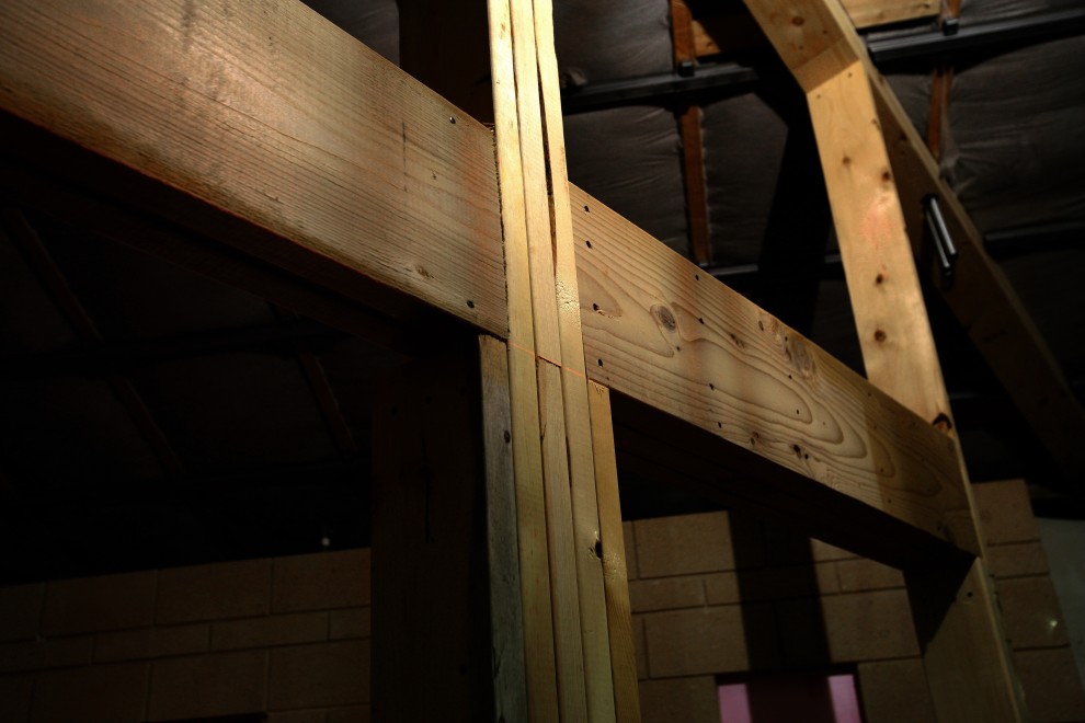 Note that the laser line is consistently above the top edge of the blocks, and filling only half of the 3/8″ high mortar joint. Then remember that the top half of this laser line was blocked by the header, and you see that at a distance of 44′ (the distance between the laser ledge and the back of the QR wall) the studio agrees with itself—masonry and carpentry—to the very limit of our measuring devices. And remember that the masons who built this wall were told “nobody’s going to see the inside of this room,” but they built it perfectly anyway.