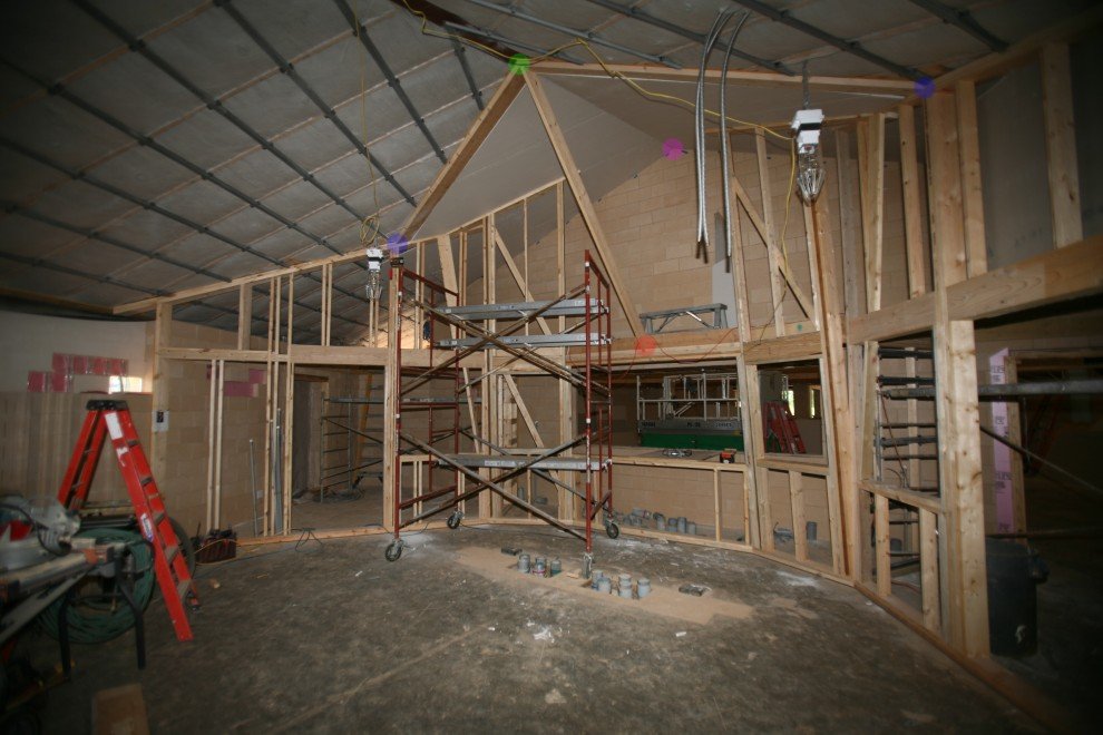 As I explained in last week’s update, the angles in any control room are unlike any angles one expects to find in normal framing carpentry. And our Control Room design has more interesting angles than most. This week we established the endpoints of the most unique framing in the project, the intersection of a sloped front wall meeting angled side walls that both intersect a ceiling that is itself both pitched and rotated. There is no steel square in the world that tells you how to measure or make those cuts. In fact, even locating where in space these different planes all intersect is a math problem unto itself. Here is the solution given in wood: