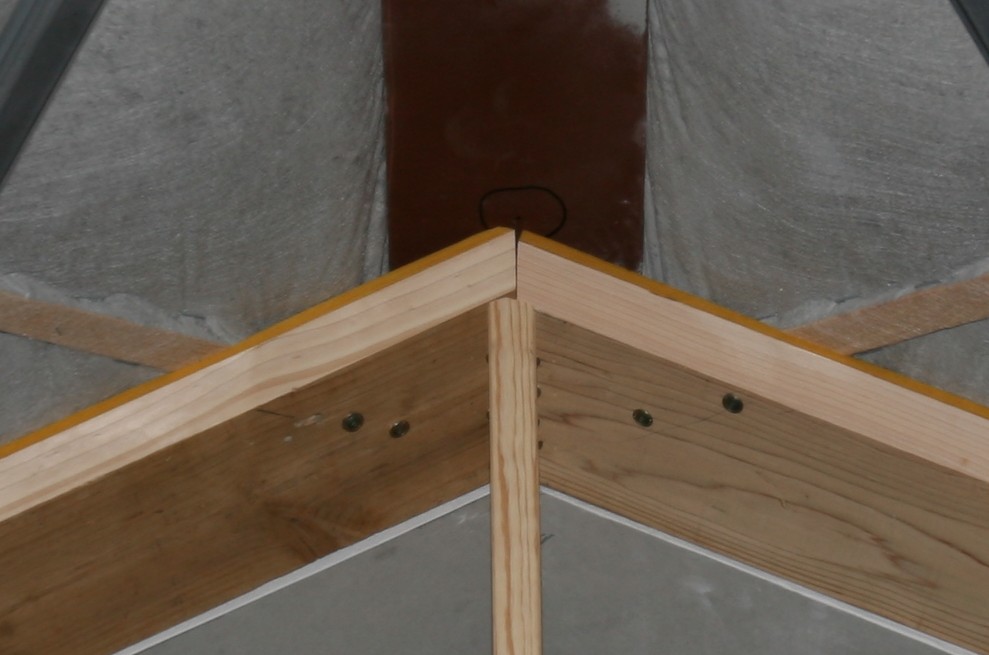 The reason the wood framing members don’t line up perfectly is because though the steel beam is set perfectly, it has a 1/8″ twist along its length. The wood members thus straighten out the shape of the room inside the control room (which is all that matters).
