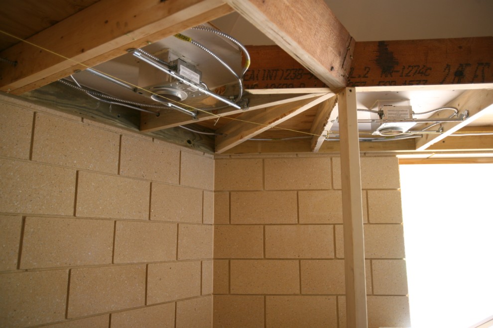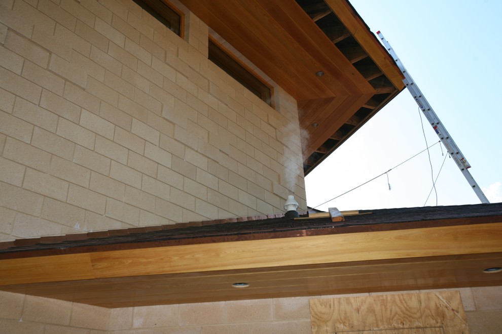 On the inside of the building, more of our light fixtures are being placed into our soffits. Sadly, one of the facts of the design is that groovy places to put lights are also great places for structural members to travel. Here we had to interrupt the sub-fascia LVL before it got to the wall plate so that a light fixture would fit. We made up for that by placing an additional three rafters to or near the corner: