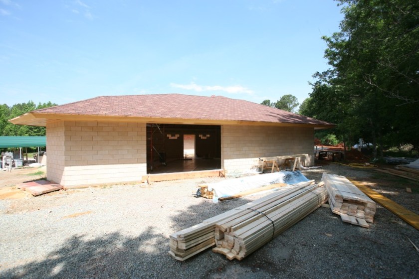 Speaking of rain…we had enjoyed several weeks of clear skies last month, which made our exterior work very easy. But now the weather has turned, and as you can see in the clay between the two buildings, even after three clear days, there’s still a good bit of moisture in the soil. Moisture that makes it quite treacherous to drive a loaded cement truck around the grounds. I understand that the better part of Thursday was spent merely working the ground (flattening grass, pouring gravel, etc.) just so the truck wouldn’t get stuck in the mud on Friday. Thankfully, it all worked out.
