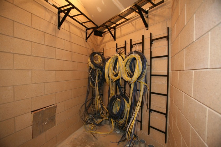 The attachment method is pretty sound: we have expoxied threaded rod going through the inner wythe and into the outer wythe, with three bolts per bracket. We should be able to carry all that cable weight without a problem. Note also that the bottoms of the brackets are over 7′ high. That gives us room to roll our racks around in the QR without any interference.