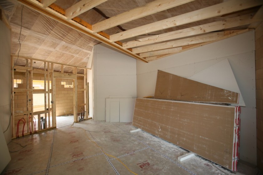 That’s almost 6 tons of acoustic mass, not including Green Glue! Moving out to the Garage you can see that since last week we got the wall framed between the Garage and the Hallway, as well as have of the ceiling joists, above which the air handlers and other utility items will go: