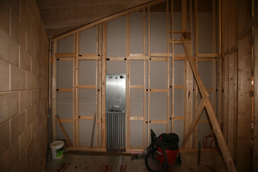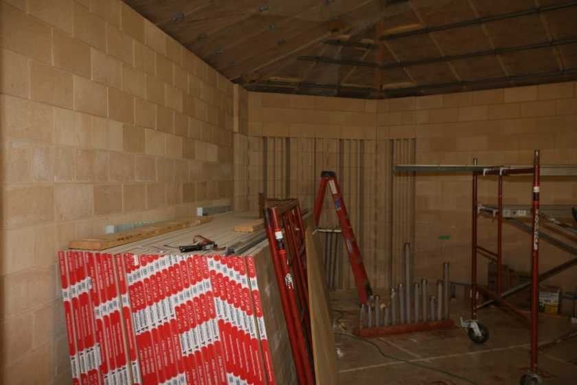 Also of note are the two layers of sheetrock we’ve installed on the back side of the western half of the rear wall. If you have been following the blog closely, you may have noticed that unlike virtually all of the walls in the Main building, which have resilient channels on at least one side of the framing or another, we are not doing this in the Annex: we don’t need to.Here we have the luxury of space to use a double-wall construction to decouple the two walls, thus we don’t need the additional layer of isolation that the resilient channel provides. In the Main building we have many environments that we want to separate acoustically (when doors are closed) but which we want to be able to integrate as one (when doors are open). The 21″ thick masonry walls that separate the Music Room from every other environment are a fine statement to make, but if we made our frame walls that thick it would push adjacent environments (such as Booth A and Booth B) too far apart from each other. Plus, it would not fit well within our 16″ column width. So we use a more complicated and expensive means in the Main to achieve what double-wall construction achieves with framing alone.
