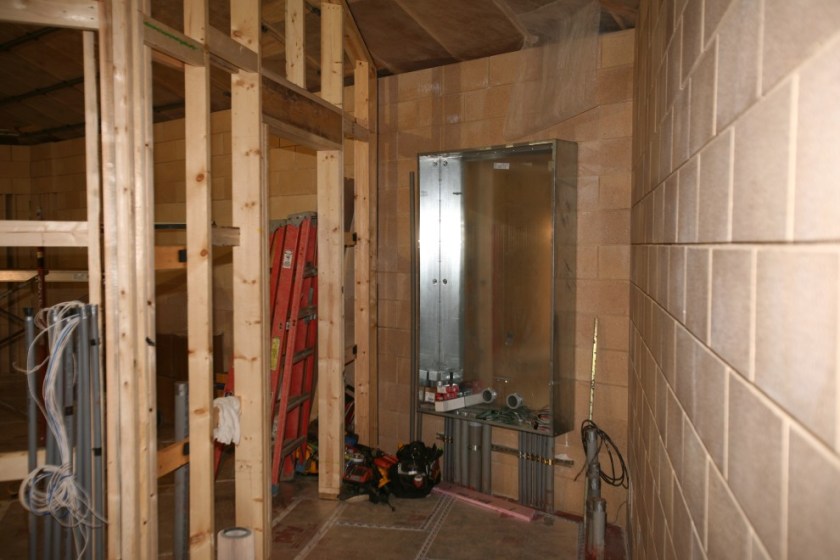 In addition to lots of framing and sheetrock work, a tremendous amount of work has been done on the electrical system as well. Here’s a shot of the (currently empty) Main Distribution Panel (MDP) in the Annex Machine Room: