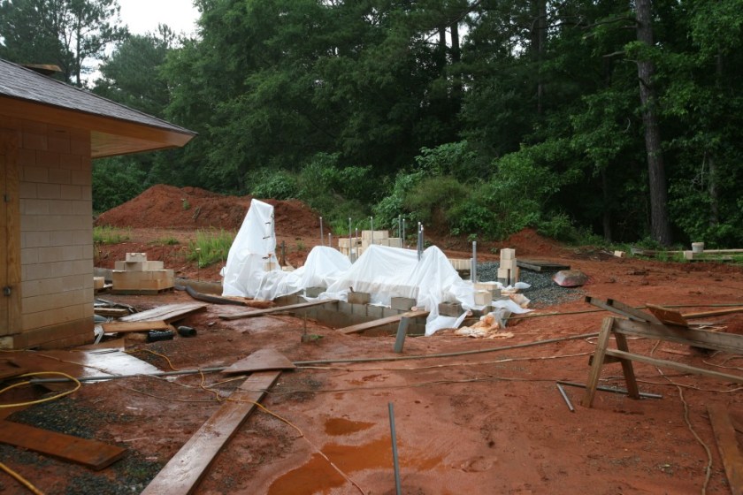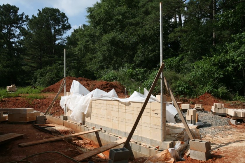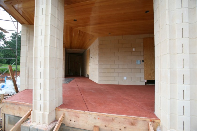 Outside, masonry work begins on the blocks facing the air conditioning units: