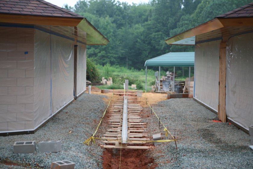 We start this week with some of the wisdom given to me by our construction foreman. Thankfully, I have never experienced the devastating impact of a flood first-hand, but I have seen the consequences of ignoring the cumulative impact that water can have on an otherwise well-designed and well-kept property. For this reason, I opted to be extra-careful in addressing potential drainage issues at every step of this project. By addressing the inclinations of water up-front, we seek to train it to travel where we’d prefer, rather than trying to control its flow post hoc. And central to that plan is our central drainage strategy: the trough drain that runs between the two buildings: