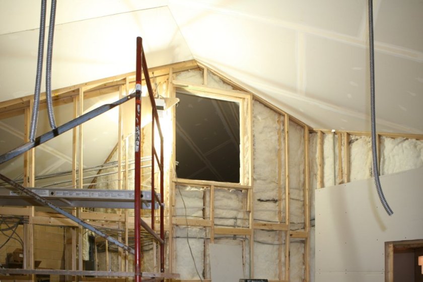 We’ve also removed the sheetrock in front of them as this will make the ducts more effective bass traps. Speaking of sheetrock, here’s the last layer going up above the control room window, fully loaded with Green Glue: