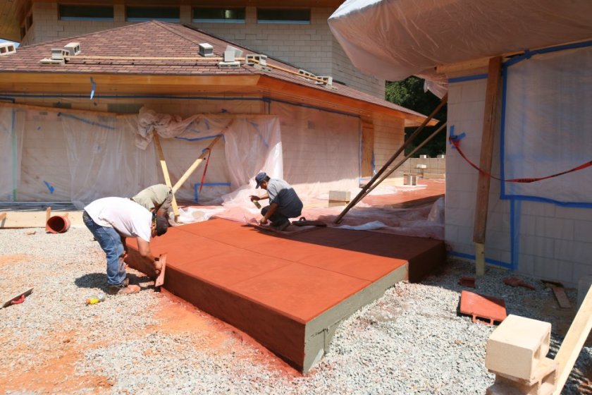 All those little gray splotches you see every 6″ in the North/South dimension and 12″ in the East/West dimension is the dust pulled up from drilling pilot holes for the tapcon screws. There are 49 screws per full board, and lots of boards (as you can see from the plans):