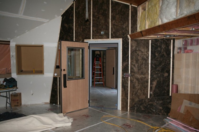 Moving along, the Control Room is seeing a lot of action as well, presently from the team that does the acoustic finish work. Here’s the latest at the back of the Control Room: