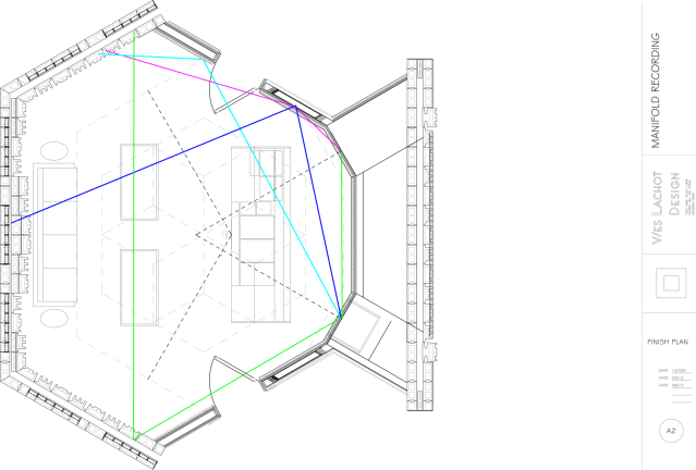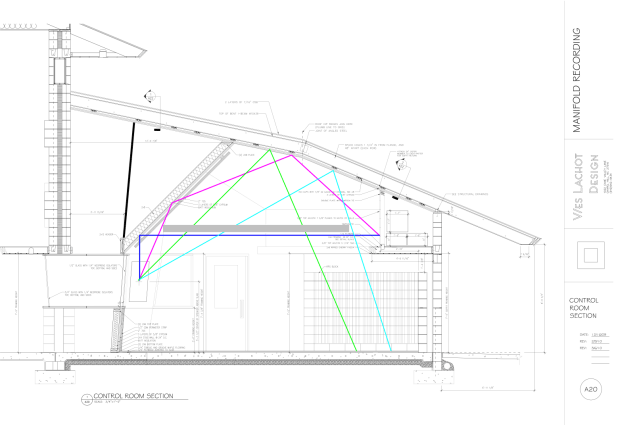 But the deflection of waves from the listening position is only part of the function (and the genius) of the Walling. Another of its functions is to act as a bass trap, solving modal build-up problems that less radical room geometries mostly fail to address and which are equally difficult to manage with small-scale after-the-fact devices. Room corners collect bass energy like dust-bunnies, and few acoustic treatments provide the bang for the buck of good corner treatments. The Control Room Section above (Page A20) shows only a sketch of the insulation fill that lies behind the Walling. A more accurate section would show that the insulation fill is basically solid all the way back to the solid black line that extends up from the inner Control Room Window framing. Compared with the typical 2′-3′ wide corner trap devices, the Walling is 8x-5x larger, resulting in more than two (and up to four) octaves more bass trapping than modular units. We estimate that the Walling can effectively trap down to 24Hz, and look forward to measuring its actual performance.