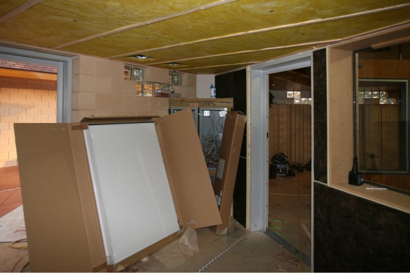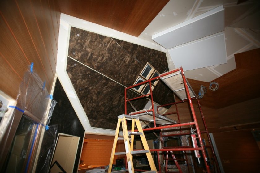 Then the fabric is fitted, along with a frame for the cloud (shown in the architectural drawings as a gray rectangle above the listening position on page A20):
