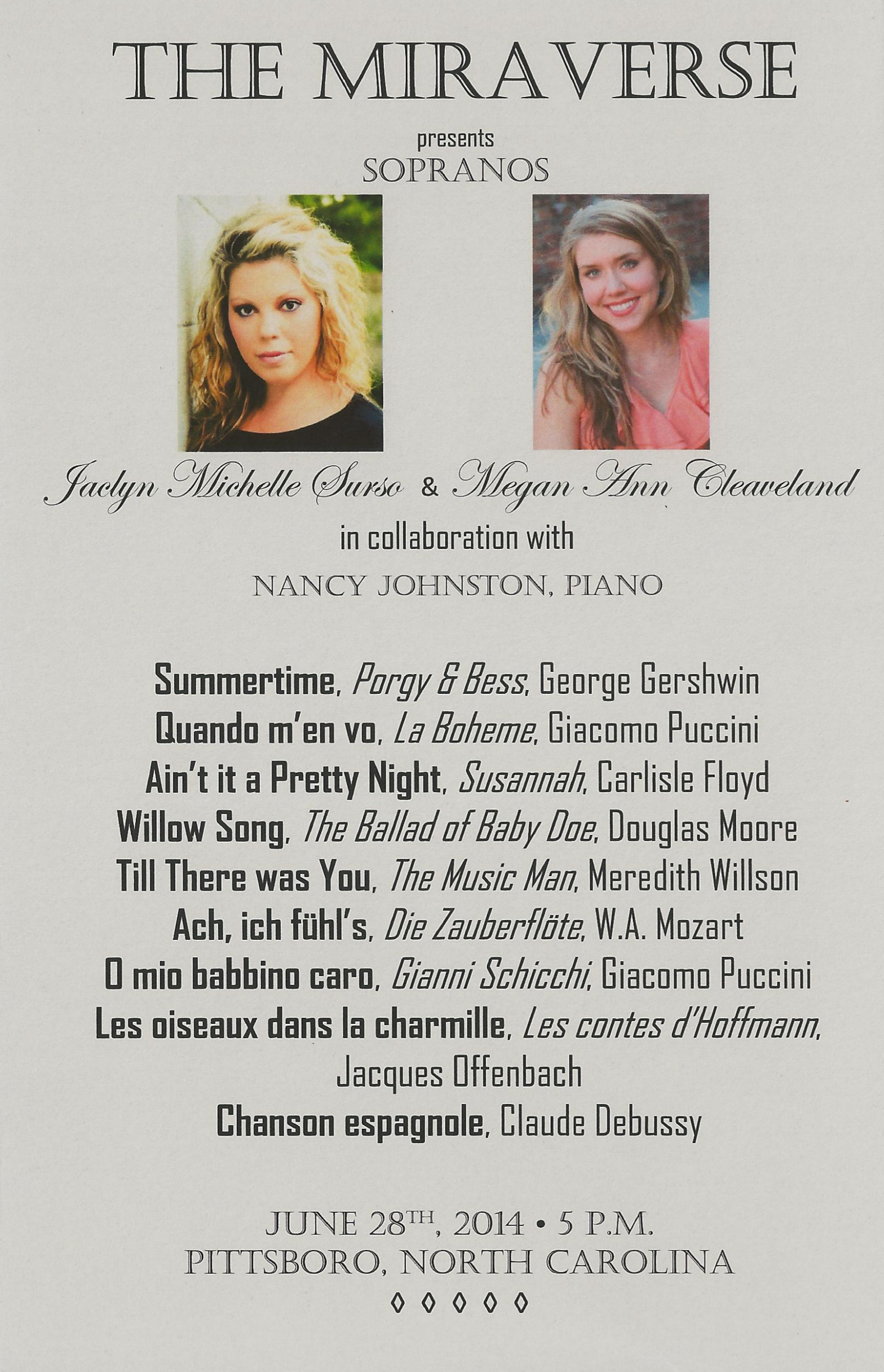 Last week we hosted a benefit recital for two fellows of the A. J. Fletcher Opera Institute, Jaclyn Surso and Megan Cleaveland. These two talented sopranos needed to raise money to offset costs to travel to Italy for the summer to study and perform under renowned soprano Renata Scotto, and we saw a perfect opportunity to help.