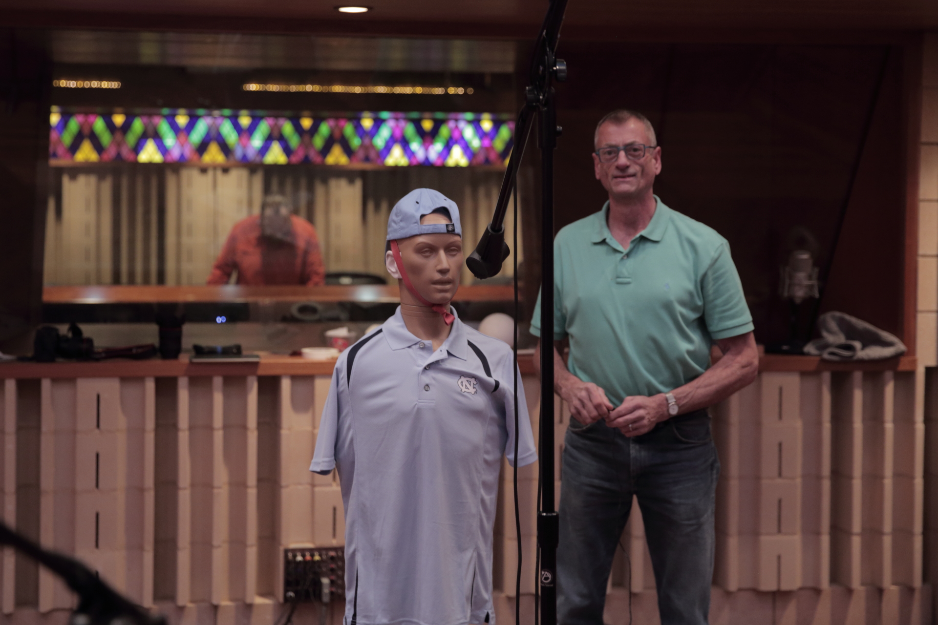 As they say, we don’t know what we don’t know, and we saw this session not only as an opportunity for the students to get some objective feedback on their acoustic performances, but also an opportunity for us to get some objective feedback on our own. Audio engineer (of the scientific kind) Dan Lilley has a KEMAR binaural recording device, which is designed to accurately capture sound the way we hear it. For example, the ears hear not only the sound traveling directly from the instruments, nor the sound as it reflects off the surfaces of the recording studio. The ears also hear sound as it reflects off, and resonates within, our own bodies. With soft skin, a torso, shoulders, resonant chambers, etc., KEMAR is designed to capture the subtle cues that tell us whether sound is to our left or right, above or below us, in front or behind us. When played through headphones (which miss all these cues), one still has a sense of position and orientation. Or so that theory goes.