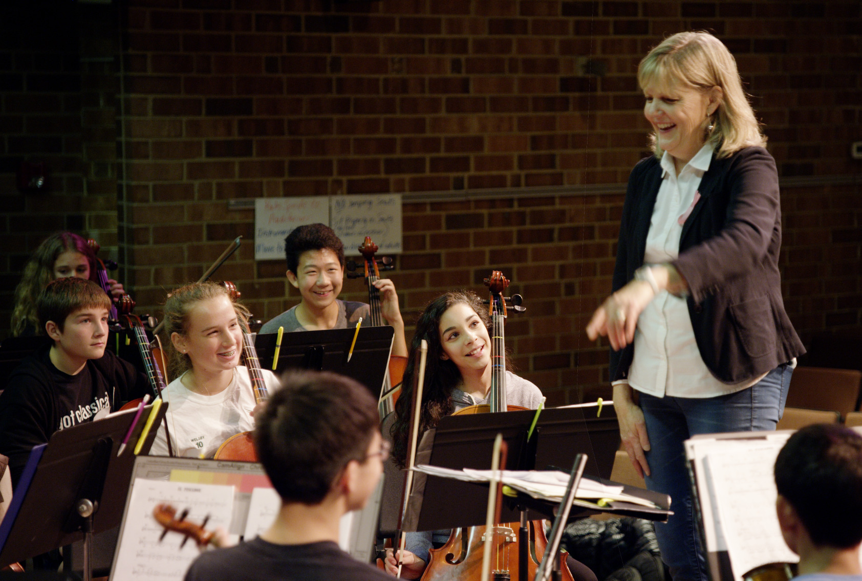 As the students began to let go of the written notes and started to feel the music, Magda then threw everybody a wonderful curveball when she asked the orchestra to improvise.  This required the students to use not only their ears, but also their hearts.  In sections written as rests for the orchestra, she invited them to find harmonic overtones of the song’s chords and to articulate those as the band took the lead.  Then, she took it a step further, inviting the violins to speak like a community of birds–with each instrument representing an individual bird call.  The children had to imagine a bird, and how that bird would call out to others.  They had to balance the singing and the listening, just as birds must do in the wild.  By the time the first of three day workshop was finished, the children moved not only beyond the score, but beyond the boundaries of country and hemisphere, becoming the birdsong of the Amazonian rainforest which they created in their own imaginations.